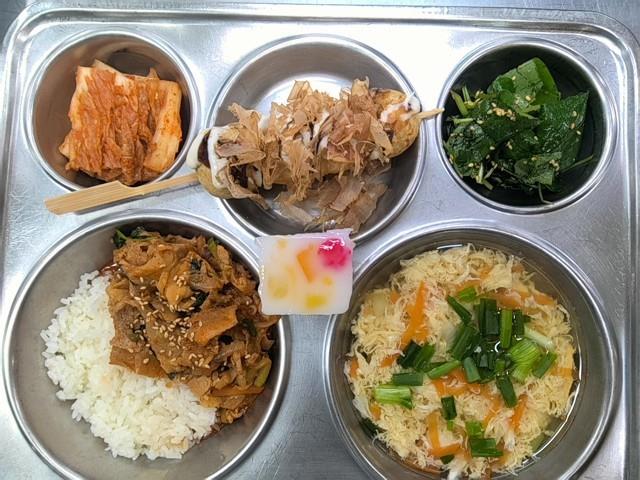 석식 제육덮밥 (5.6.10.13) 달걀파국 (1.5.6.8.9.18) 취나물새콤무침 (5.6.13) 타코야끼꼬치 (1.2.5.6) 배추김치 (9) 요거트푸딩(판) (1.2.5)
