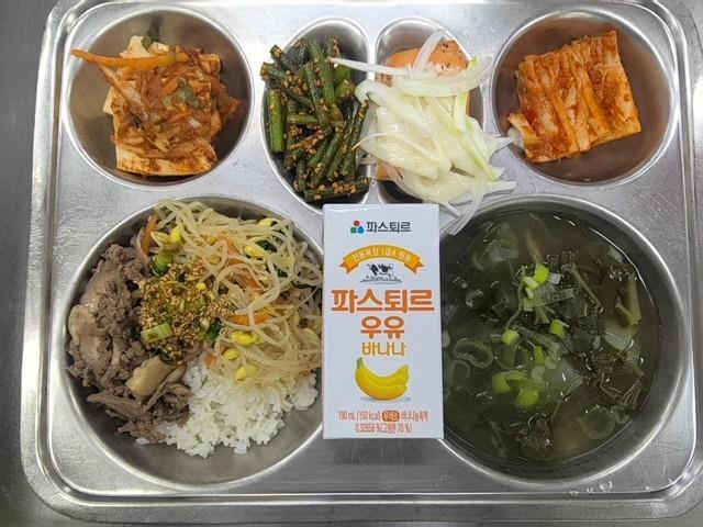 중식 한우콩나물밥/양념장 (5.6.16) 근대된장국 (5.6.8.9.18) 두부조림 (5.6.13) 마늘종무침(자율) (5.6.13) 코코넛치즈갈릭연어스테이크*양파채 (2.5) 배추김치 (9) 바나나우유(선택) (2) 딸기우유(선택) (2)