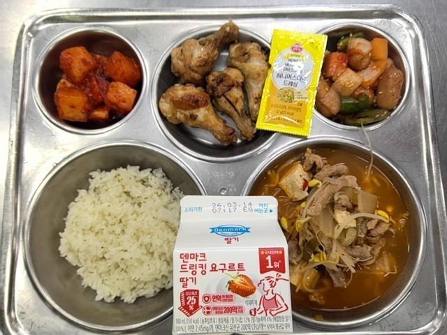 조식 청차조밥 돈육김치찌개 (5.6.8.9.10.18) 비엔나케첩볶음 (2.5.6.10.12.13.15.16) 닭봉구이 (5.6.13.15) 깍두기 (9) 허니머스터드(개별용) (1.5.6.13) 드링크요구르트-딸기 (2)