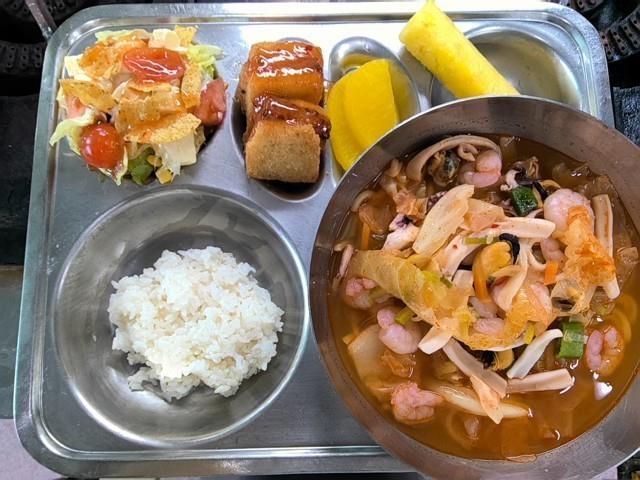 중식 쌀밥-소량(먹을사람만) 얼큰한해물짬뽕 (5.6.8.9.13.17.18) 나쵸샐러드 (1.2.5.6.12.13) 멘보샤 (1.2.5.6.9.18) 멘보타코 (1.2.5.6.8.9.16.17.18) 노란단무지 스위트칠리소스 (5.6.12.13) 파인애플생과-스틱