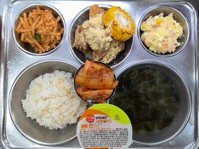 석식 찰기장밥 미역미소국 (5.6.8.9.18) 무생채(자율) (5.6.13) 베이컨감자샐러드 (1.5.10.13) 콘소메달콘치킨 (1.2.5.6.15) 배추김치 (9) 자몽에이드