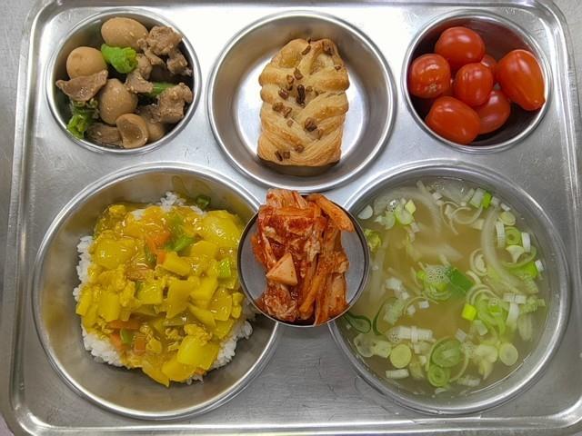 카레라이스 (2.5.6.10.12.13.16)감자양파채국 (5.6.8.9.18)돈육메추리알장조림 (1.5.6.10.13)배추김치 (9)메이플피칸파이 (1.2.5.6.14)대추방울토마토 (12)중식
