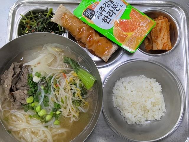 석식 쌀밥-소량(먹을사람만) 양지쌀국수 (16) 공심채(모닝글로리)볶음 (5.6.13.18) 넴롤짜조/스위트칠리소스 (1.5.6.10.12.13) 배추김치 (9) 감귤한라봉주스 (13)