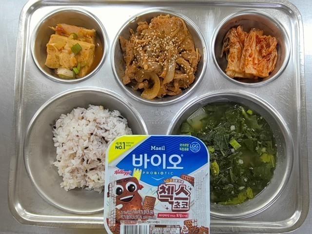 조식 혼합잡곡밥 (5) 아욱국 (5.6.8.9.18) 두부조림 (5.6.13) 오리불고기 (5.6.13) 배추김치 (9) 떠먹는요구르트-첵스 (2)