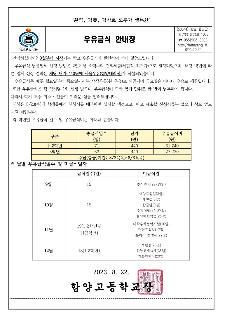 2023학년도 2학기 우유급식 안내장