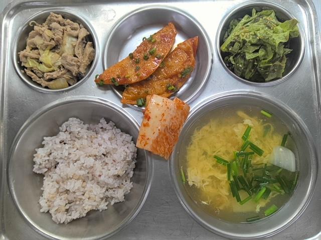석식 혼합잡곡밥 (5) 달걀파국 (1.5.6.8.9.18) 매콤만두범벅 (1.5.6.10.16.18) 상추겉절이(자율) (5.6.13) 간장돼지불고기 (5.6.10.13) 직접담은김치 (9)