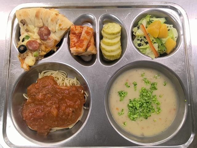 중식 브로콜리크림스프 (2.5.6.13.16) 토마토스파게티 (1.2.5.6.10.12.13.16) 콘크러스트피자 (1.2.5.6.10.12.13.15.16) 황도양상추샐러드 (11) 직접담은김치 (9) 오이피클(자율) 파인드레싱 (1.2.5.6)