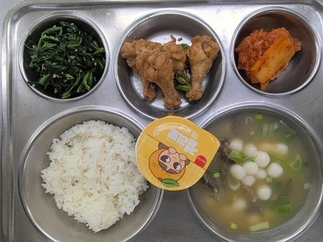 조식 친환경쌀밥 조랭이떡국(5.6.8.9.16.18) 닭봉간장조림(5.6.13.15) 시금치나물(5.6) 직접담은김치(자율)(9) 과일젤리