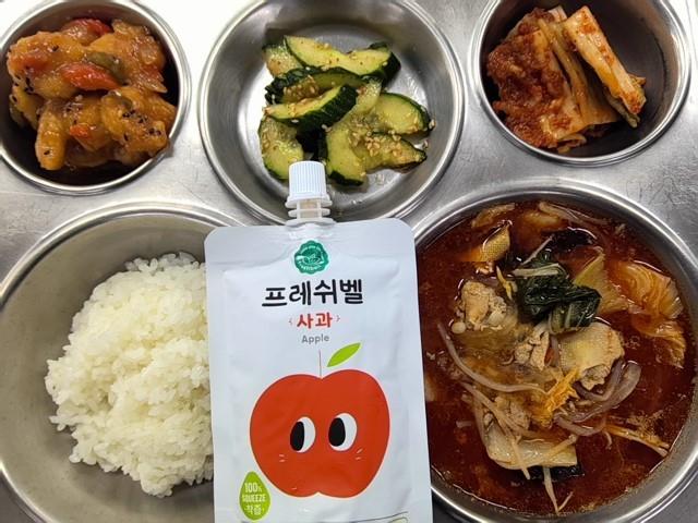 석식 친환경쌀밥 한국식마라탕(2.5.6.10.13.16) 깐쇼새우&강정소스(1.5.6.9.12.13) 오이무침(자율)(5.6.13) 직접담은김치(자율)(9) 사과주스(13)