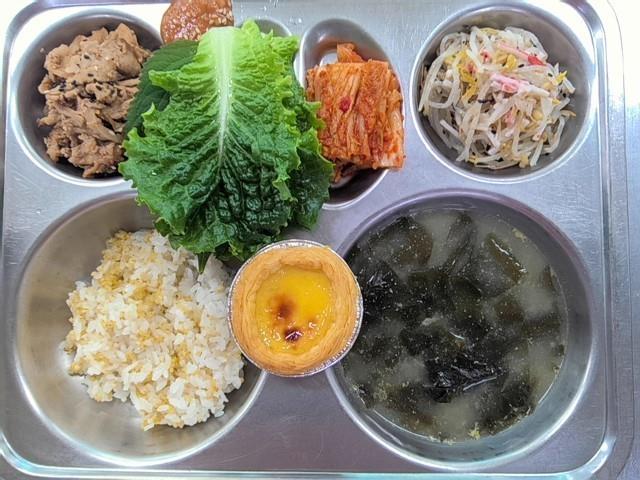중식 기장밥 들깨미역국(5.6.8.9.18) 숙주맛살무침(자율)(1.5.6.8) 광양식바싹불고기(5.6.10.12.13) 직접담은김치(자율)(9) 에그타르트(1.2.5.6.16) 상추깻잎쌈&수제쌈장(5.6.13)