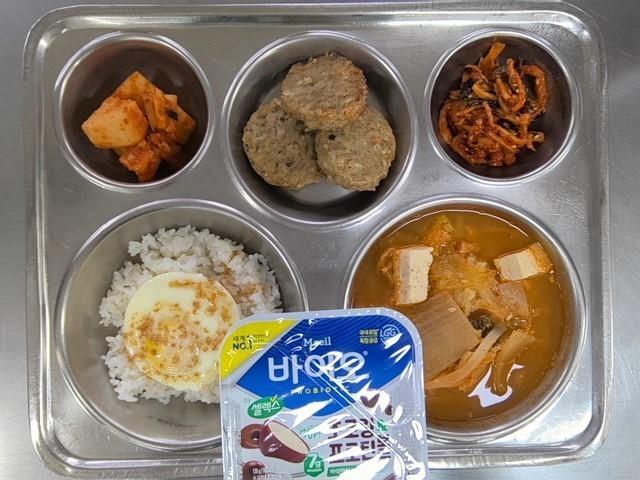 조식 간장계란밥(1.5.6) 돈육김치찌개(5.8.9.10.18) 무말랭이진미채무침(5.6.13.17) 고추잡채주먹완자(1.2.5.6.10.15.16.18) 직접담은깍두기(자율)(9) 토핑요거트(초코링&프로틴볼)(2)