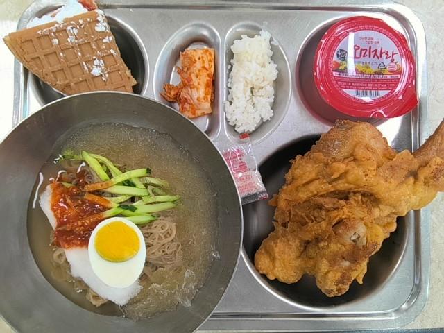 중식[입학100일축하밥상] 미니밥(자율) 비빔물냉면(1.3.5.6.13.16) 누룽지반마리치킨(2.6.15.18) 직접담은김치(자율)(9) 생크림와플(2.5.6.13) 오미자주스