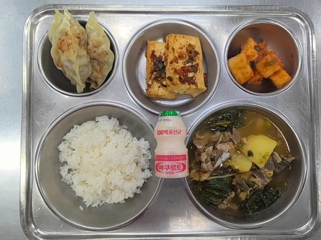 석식 친환경쌀밥 돈등뼈감자탕(5.10) 간장두부조림(5.6.13) 왕교자찐만두&초간장(5.6.10.13.16.18) 직접담은깍두기(자율)(9) 옛날요구르트(2)