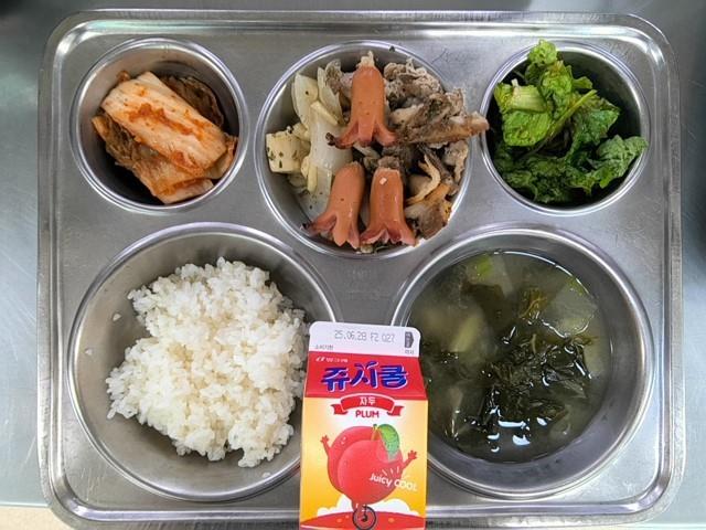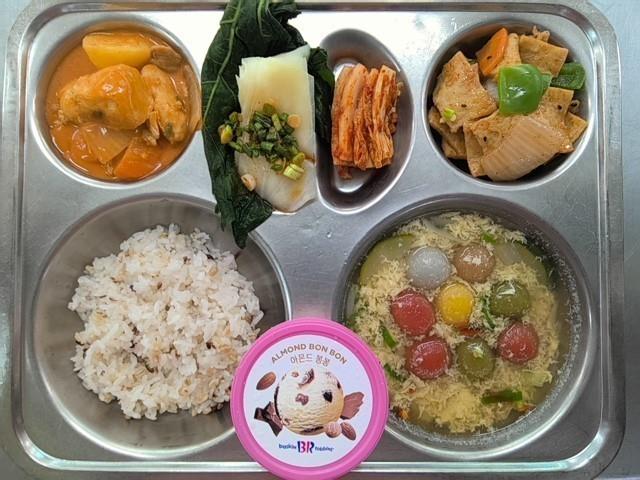 중식 혼합잡곡밥(5) 오색옹심이국(1.5.6.8.9.18) 사각어묵조림(1.5.6) 로제찜닭(2.5.6.15.16) 양배추호박잎쌈&양념장(자율)(5.6) 직접담은김치(자율)(9) 아이스크림(2.5)