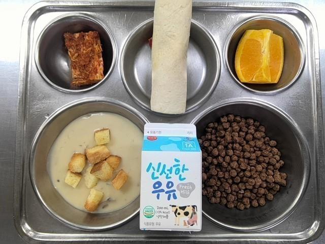 조식 양송이크림스프&크루통(2.5.6.13.15.16) 떡갈비스낵랩 (1.2.5.6.10.15.16.18) 직접담은김치(자율)(9) 오렌지 우유(2) 초코첵스시리얼(5.6)