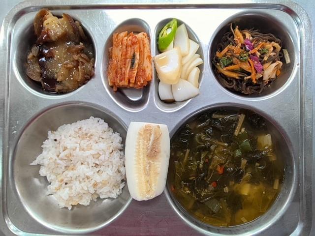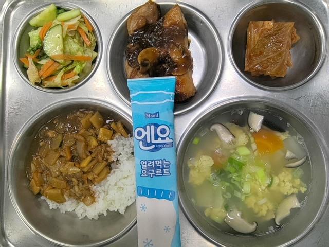 석식 하이라이스(1.2.5.6.8.9.10.12.13.16.18) 달걀파국(1.8.9.18) 양상추샐러드&오리엔탈D.(5.6) 닭다리살숯불스테이크(5.6.12.13.15.16) 직접담은김치(자율)(9) 얼려먹는요구르트(2)