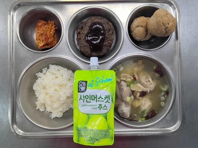조식 친환경쌀밥 닭곰탕(15) 도토리떡갈비&사과소스(5.6.10.13.15.16.18) 직접담은김치(자율)(9) 샤인머스켓주스(13) 초코앙슈(1개)(1.2.5.6)