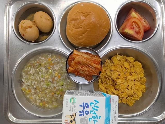 조식 쇠고기채소죽(5.6.16) 우유크림빵(1.2.5.6.10) 계란장조림(1.5.6.13) 직접담은김치(자율)(9) 곡물시리얼(5.6) 꿀먹은토마토(12) 우유(2)