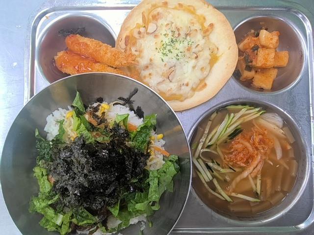 중식 [다채롭데이(채식급식)] 주꾸미채소비빔밥(5.6) 도토리묵냉국(5.6.8.9.18) 새우튀김&칠리소스(1.5.6.9.12) 직접담은김치(자율)(9) 수제고구마피자(2.5.6.13)