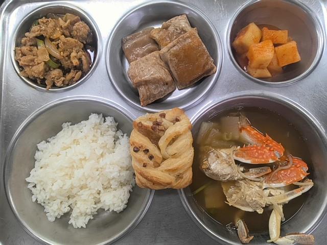 석식 친환경쌀밥 꽃게매운탕(5.6.8.9.18) 돼지고기두루치기(5.6.10.13) 미니메밀전병(2.3.5.6.16.18) 직접담은깍두기(자율)(9) 메이플피칸파이(1.2.6.13.14)