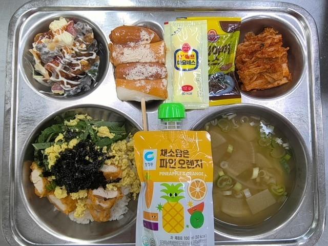 중식 치킨마요덮밥(1.5.6.13.15.18) 맑은장국(1.2.5.6.7.8.9.13.18) 나쵸샐러드(1.2.5.6.12.13.16) 직접담은김치(자율)(9) 뿌링클소떡소떡(5.6.12.13) 파인오렌지주스(13)