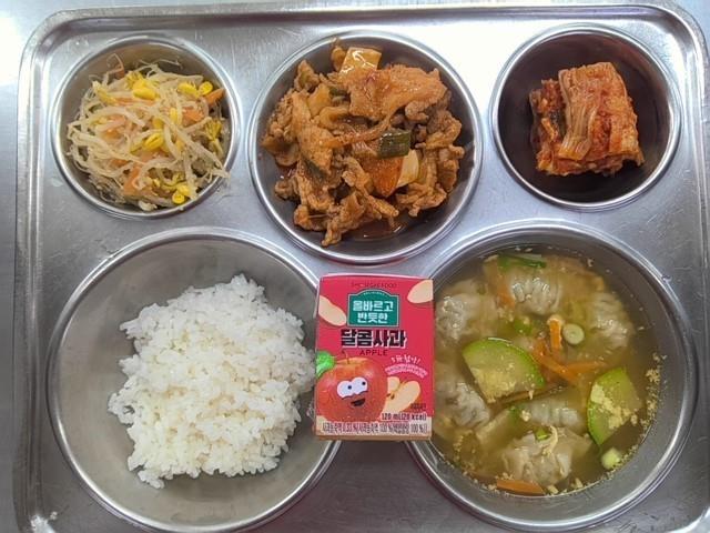 조식 친환경쌀밥 물만두국(1.5.6.8.9.10.16.18) 콩나물무침(5) 돈육고추장불고기(5.6.10.13) 직접담은김치(자율)(9) 사과주스(13)