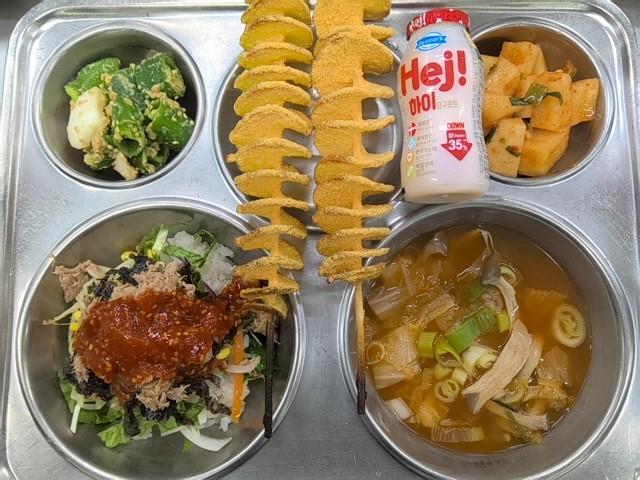 석식 참치야채비빔밥(5.6.13.16.18) 느타리김치국(8.9.18) 아삭고추된장무침(자율)(5.6) 직접담은깍두기(자율)(9) 요구르트(2) 회오리감자(5.6)