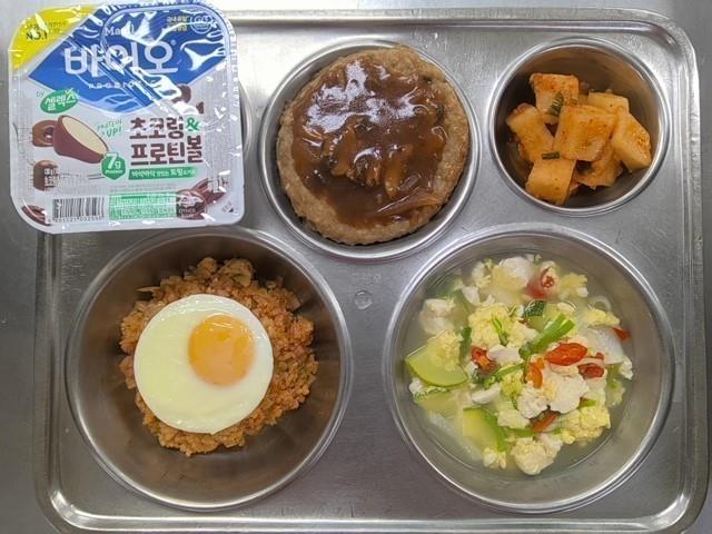 조식 김치볶음밥&달걀후라이(1.5.6.9.10.12.13.16.18) 맑은순두부탕(1.5.8.9.18) 함박스테이크&수제소스(1.2.5.6.10.12.13.15.16.18) 직접담은깍두기(자율)(9) 토핑요거트(초코링&프로틴볼)(2)
