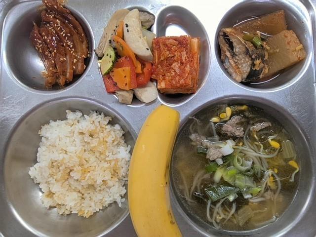 중식 노랑차조밥 사골우거지국(5.6.16) 고등어무조림(5.6.7.13) 매콤직화통바베큐(2.4.5.6.9.10.12.15.16.17.18) 모듬채소구이 직접담은김치(자율)(9) 바나나