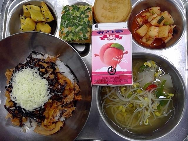 중식 눈꽃치즈제육덮밥(2.9.10.13) 맑은콩나물국(5.8.9.18) 달걀찜(1) 직접담은깍두기(자율)(9) 고구마맛탕(13) 복숭아맛주스(2.11) 우리밀슈크림100점빵(1.5.6)