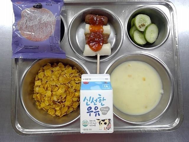 조식 옥수수스프(2.5.6.13.15.16) 블루베리도넛(1.2.5.6) 수제오이피클(자율)(13) 소떡갈떡&소스(2.5.6.10.12.15.16) 곡물시리얼(5.6) 바나나 우유(2)