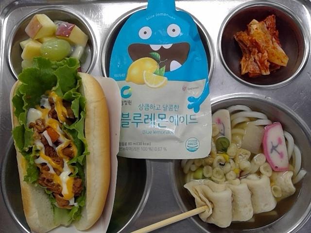 석식 미니꼬치어묵우동(1.2.5.6.7.8.9.13.18) 불고기핫도그(1.2.5.6.10.12.13.15.16) 과일샐러드&요거트D.(1.2.5.6) 직접담은김치(자율)(9) 블루레몬에이드