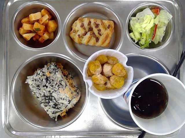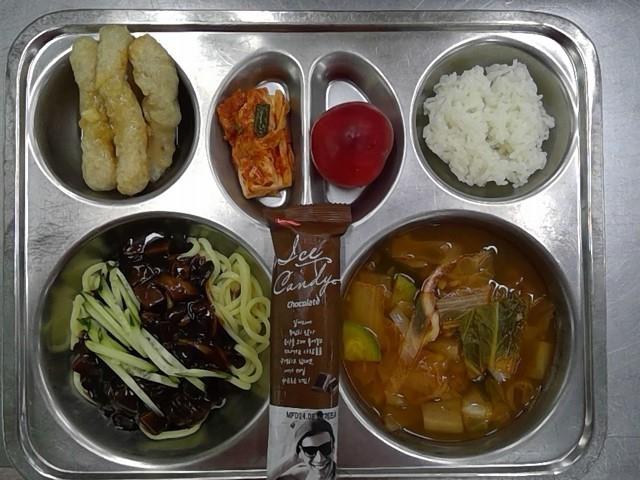 중식 자장면(1.5.6.10.13.16.18) 쌀밥-소량(먹을사람만) 얼큰한짬뽕국(5.6.8.9.13.17.18) 글루텐프리찹쌀탕수육(1.5.6.10.13) 자두 아이스캔디(초코or바닐라)(1.2.5)