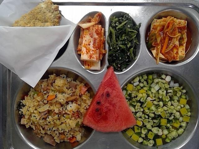 중식 매콤훈제오리야채볶음밥(5.6.13.18) 가쓰오장국(1.2.5.6.7.8.9.18) 두부조림(5.6.13) 취나물볶음(자율)(5.6) 대만지파이/시즈닝(1.2.5.6.15) 배추김치(9) 수박