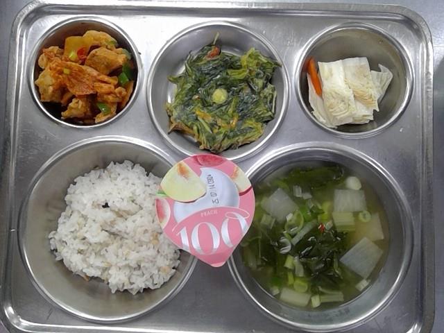 석식 혼합잡곡밥(5) 근대된장국(5.6.8.9.18) 돈육묵은지찜(5.6.9.10.13) 청량초부추전(1.5.6) 백김치(9) 떠먹는요구르트_복숭아(저당)(2)