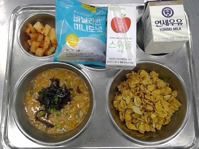 조식 시리얼-아몬드(5.6) 낙지야채죽(8.9.18) 직접담은깍두기(9) 백색우유(2) 바닐라빈미니도넛(1.2.5.6) 피크닉-사과(2)