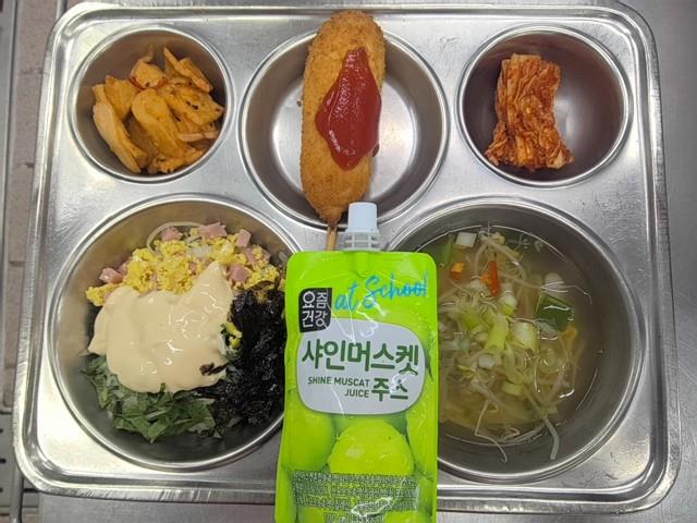석식 햄마요덮밥(1.2.5.6.10.13.15.16.18) 맑은콩나물국(5.6.8.9.18) 매콤어묵볶음(1.5.6.13) 크리스피반반핫도그*케첩(1.2.5.6.10.12.15.18) 배추김치(9) 샤인머스켓주스(13)