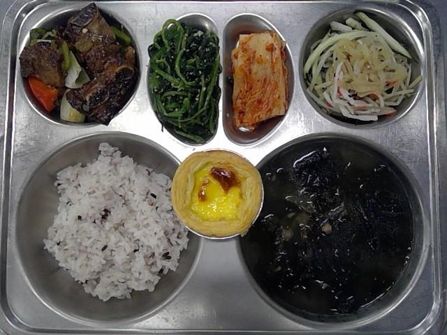 중식 검정쌀밥 쇠고기미역국(5.6.8.9.16.18) 시금치무침(5.6) 해파리냉채(자율)(1.5.6.8.13) 돼지갈비구이(1.5.6.10.16) 배추김치(9) 에그타르트(1.2.5.6)