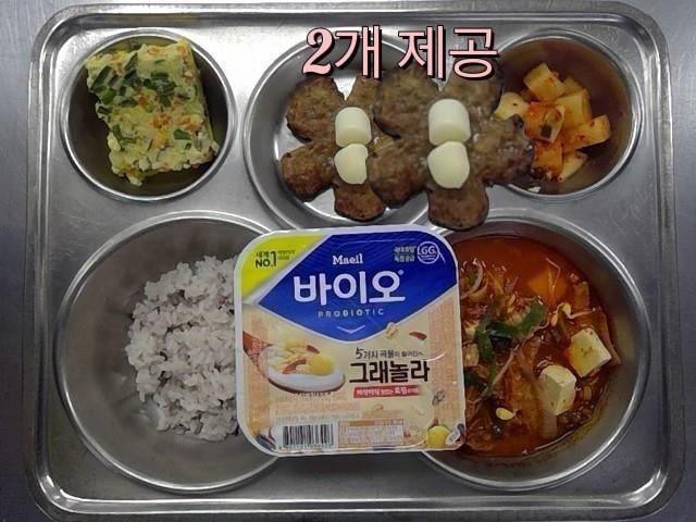 조식 검정쌀밥 돈육김치찌개(5.6.8.9.10.18) 삼색계란찜(1) 활짝 핀 떡갈비(5.6.10.15.16.18) 직접담은깍두기(9) 떠먹는요구르트-그래놀라(2)