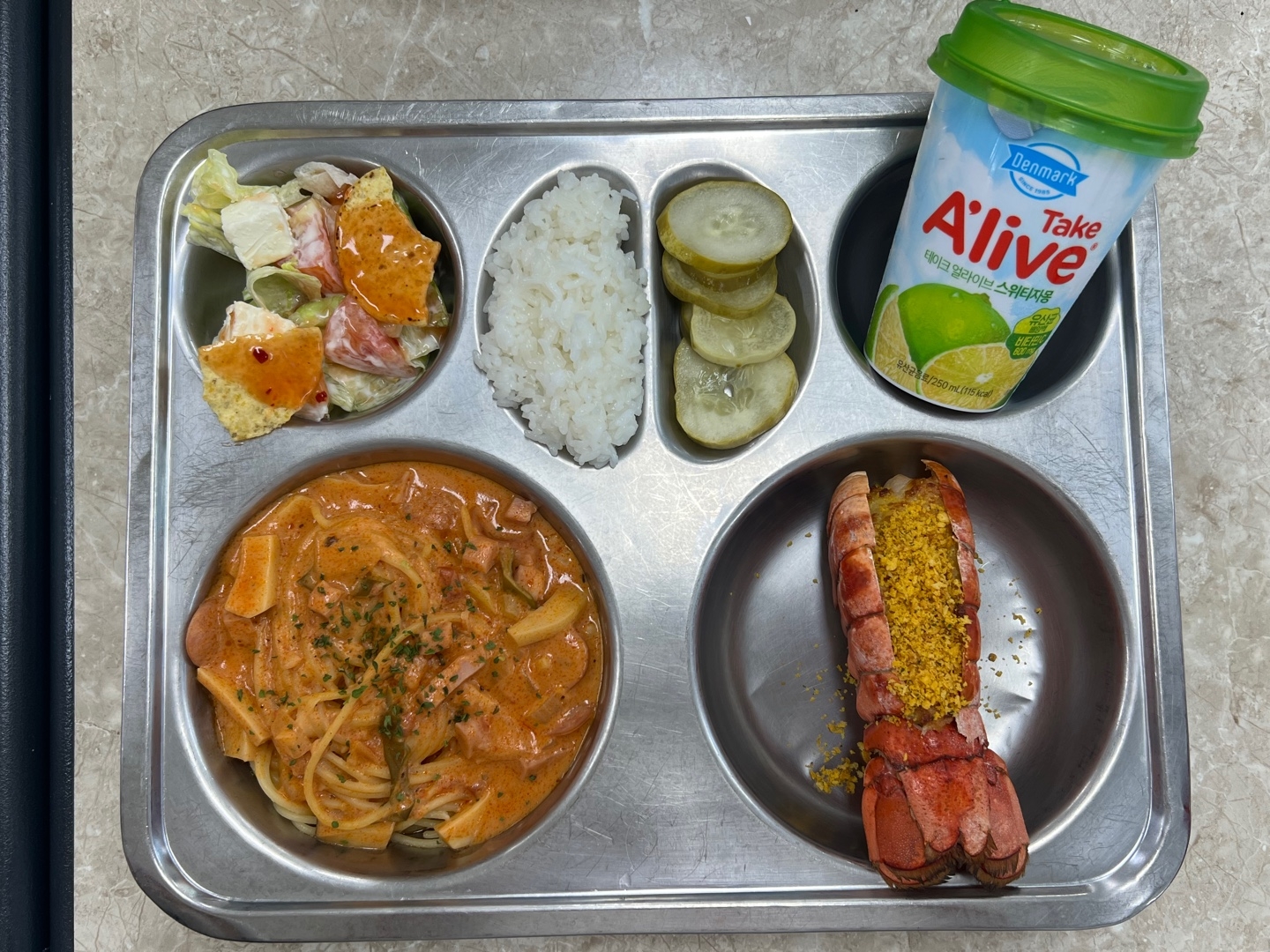 중식 쌀밥-소량(자율) 로제스파게티 (1.2.5.6.12.13) 나쵸샐러드 (1.2.5.6.12.13) 랍스타치즈구이 (1.2.5.13) 오이피클 스위티자몽주스 (13)