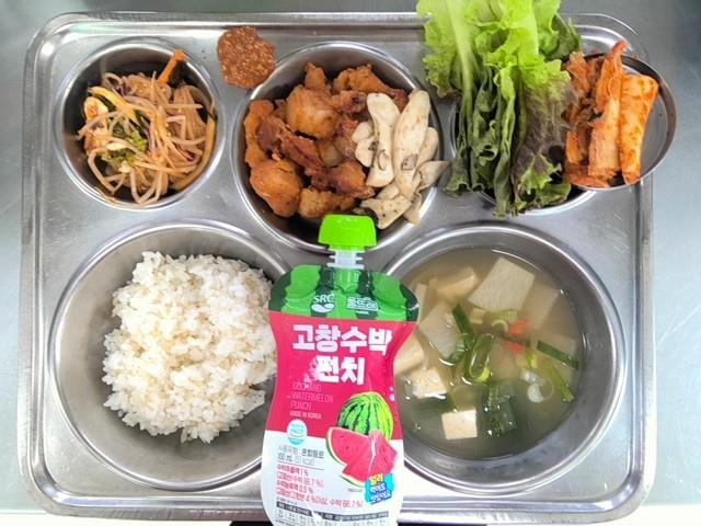 석식 발아현미밥 된장찌개 (5.6.8.9.18) 쫄면야채무침 (5.6.12.13) 맵단돈구이 (10) 배추김치 (9) 상추쌈 수박주스 (13)