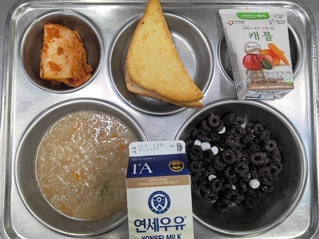 조식 시리얼-오레오 (5.6) 참치야채죽 (5.16.18) 배추김치 (9) 백색우유 (2) 몬테크리스토샌드위치 (1.2.5.6.10) 캐플주스 (13)