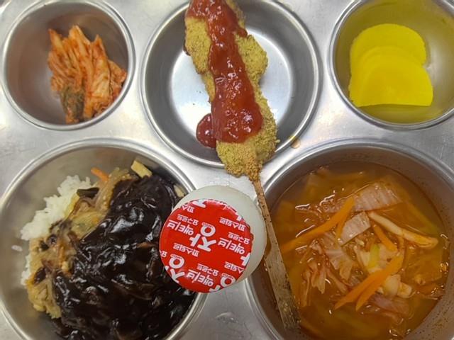 석식 잡채밥/자장소스(1.5.6.10.13.16.18) 얼큰한짬뽕국(5.6.8.9.13.17.18) 통닭다리살꼬치(1.5.6.15.16) 노란단무지 배추김치(9) 마시는요구르트사과(2)