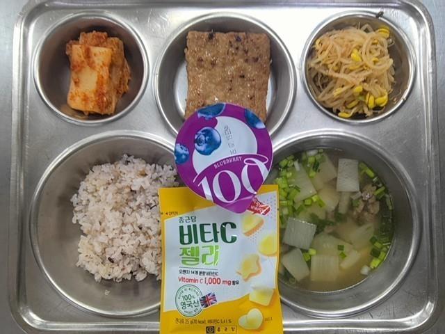 조식 혼합잡곡밥(5) 맑은소고기무국(5.6.8.9.16.18) 붉은콩나물무침(5) 너비아니구이(2.5.6.10.12.15.16.18) 배추김치(9) 떠먹는요구르트_블루베리(저당)(2) 비타민C젤리