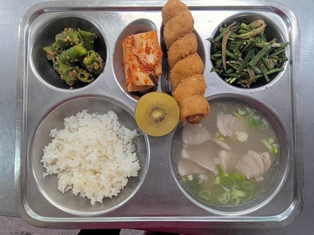 중식 소면사리 돼지국밥(5.6.9.10.13) 부추겉절이(5.6.13) 뱅글뱅글소시지(2.5.6.10.15.16) 배추김치(9) 골드키위 아삭고추된장무침(자율)(5.6)