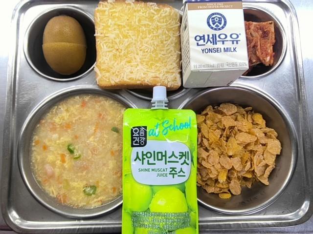 조식 달콤한연유토스트(1.2.5.6) 시리얼-콘푸라이트(5.6) 새우계란죽(1.9) 배추김치(9) 골드키위 백색우유(2) 샤인머스켓주스(13)