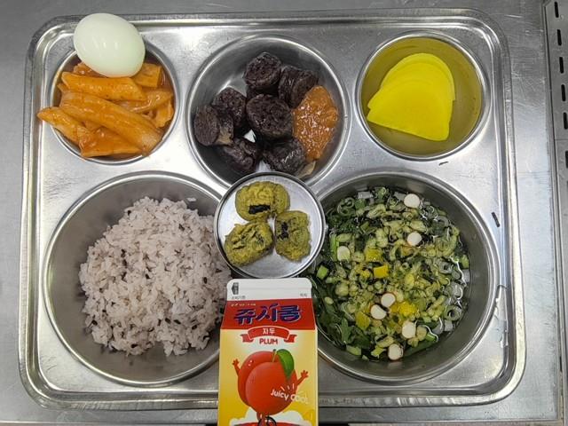 석식 검정쌀밥 가쓰오장국(1.2.5.6.7.8.9.18) 찐순대/쌈장(2.5.6.10.13.16) 분모자쌀떡볶이*달걀(1.5.6.8.9.18) 꼬마김말이(3p)(1.5.6.16) 노란단무지 쥬시자두(2)
