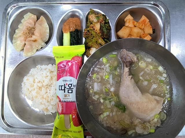 중식 현미밥 누룽지장각삼계탕(15) 단배추겉절이(자율)(5.6.13) 왕교자만두(찜)(5.6.10.16.18) 깍두기(9) 오이스틱 딸기아이스바(1.2.5)
