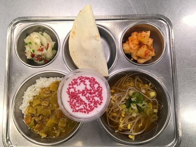 석식 하이스카레밥(1.2.5.6.10.12.13.16) 얼큰콩나물국(5.6.8.9.18) 노각무침(자율)(5.6.13) 깍두기(9) 소고기퀘사디아(2.5.6.10.12.13.16) 수제딸기라떼(2)