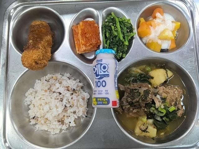 중식 혼합잡곡밥(5) 돈등뼈감자탕(5.6.9.10) 쑥갓나물무침(자율)(5.6) 고구마치즈롤까스(1.2.5.6.10) 배추김치(9) 돈까스소스(5.6.12.13.18) 저당요구르트(2) 열대과일샐러드(1.2.5.6)